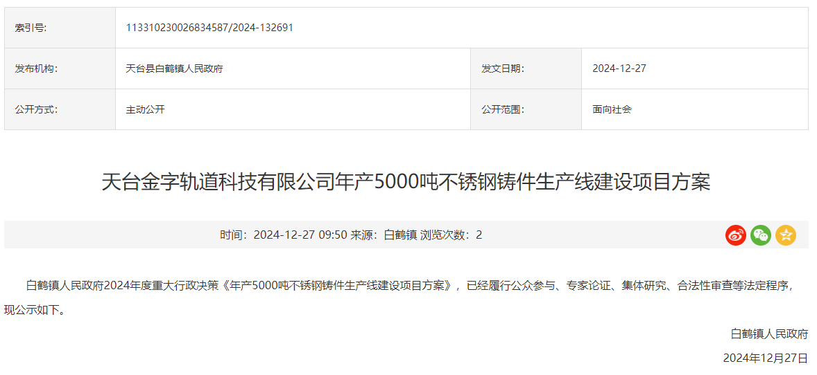 2024年12月27日,白鶴鎮(zhèn)人民政府就天臺金字軌道科技有限公司年產(chǎn)5000噸不銹鋼鑄件生產(chǎn)線建設項目方案對外進行公示。