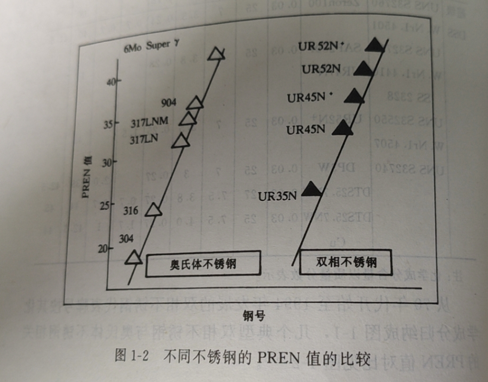 從70年代開始至1994年發(fā)展的雙相不銹鋼代表牌號按其化學成分歸納成圖1-1,幾個典型雙相不銹鋼與奧氏體不銹鋼相關的PREN值對比見圖1-2.