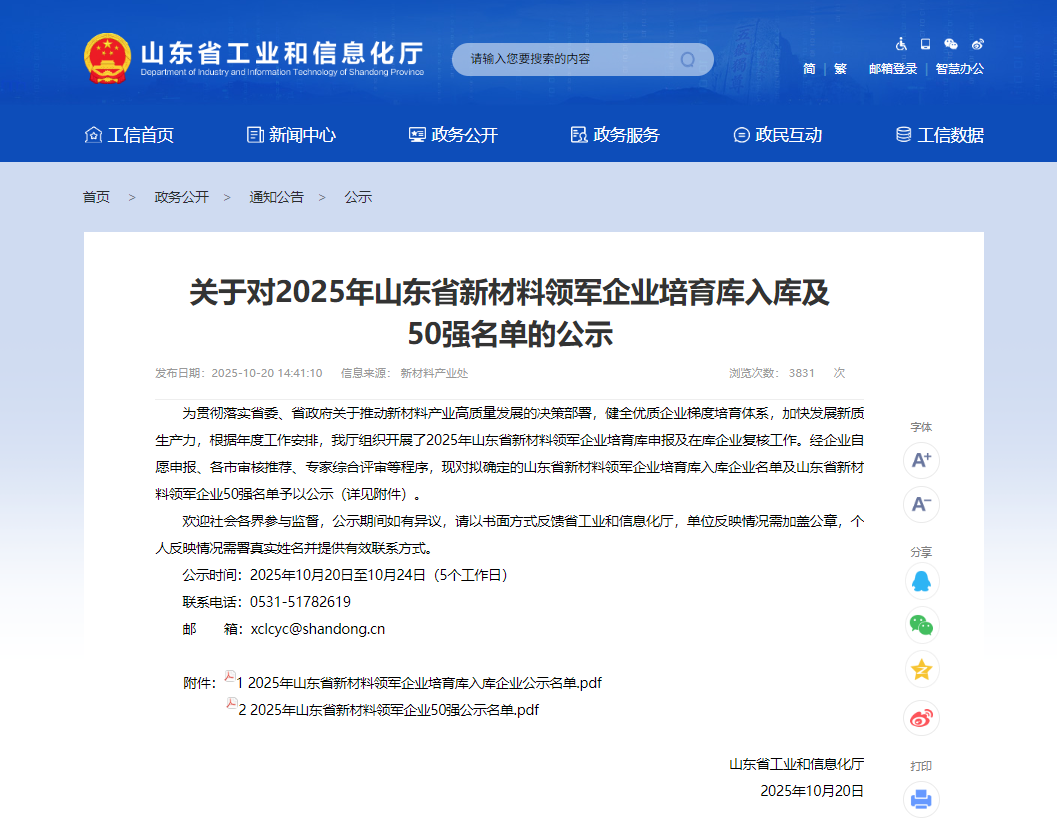 10月20日,山東省工業(yè)和信息化廳發(fā)布了《關于對2025年山東省新材料領軍企業(yè)培育庫入庫及50強名單的公示》。